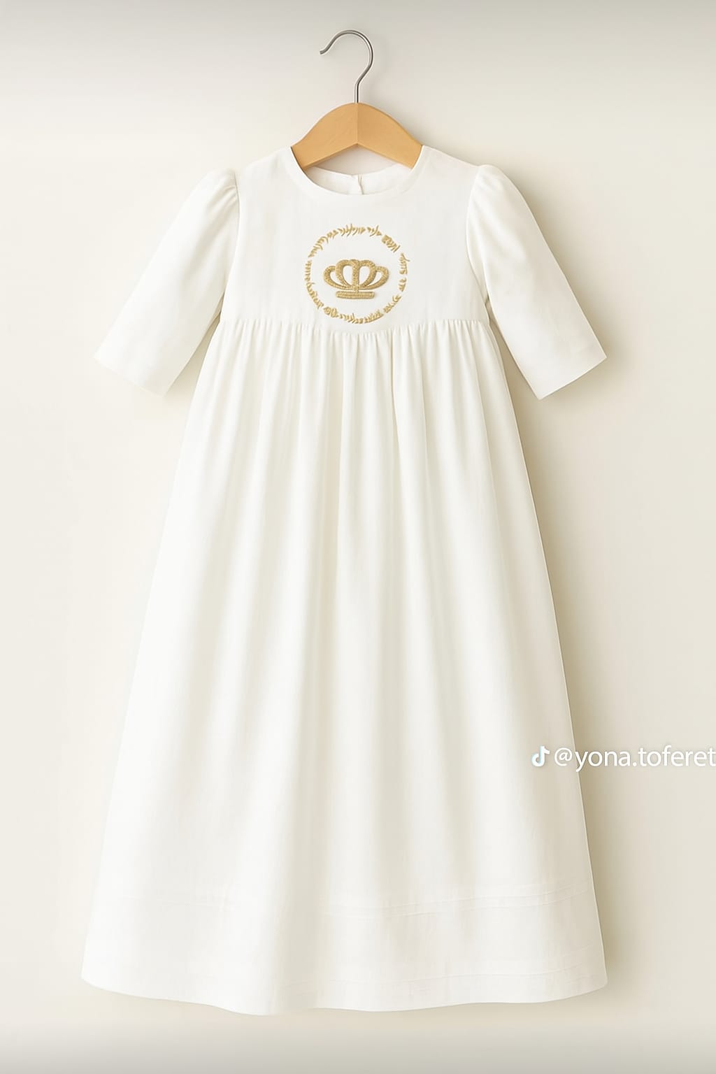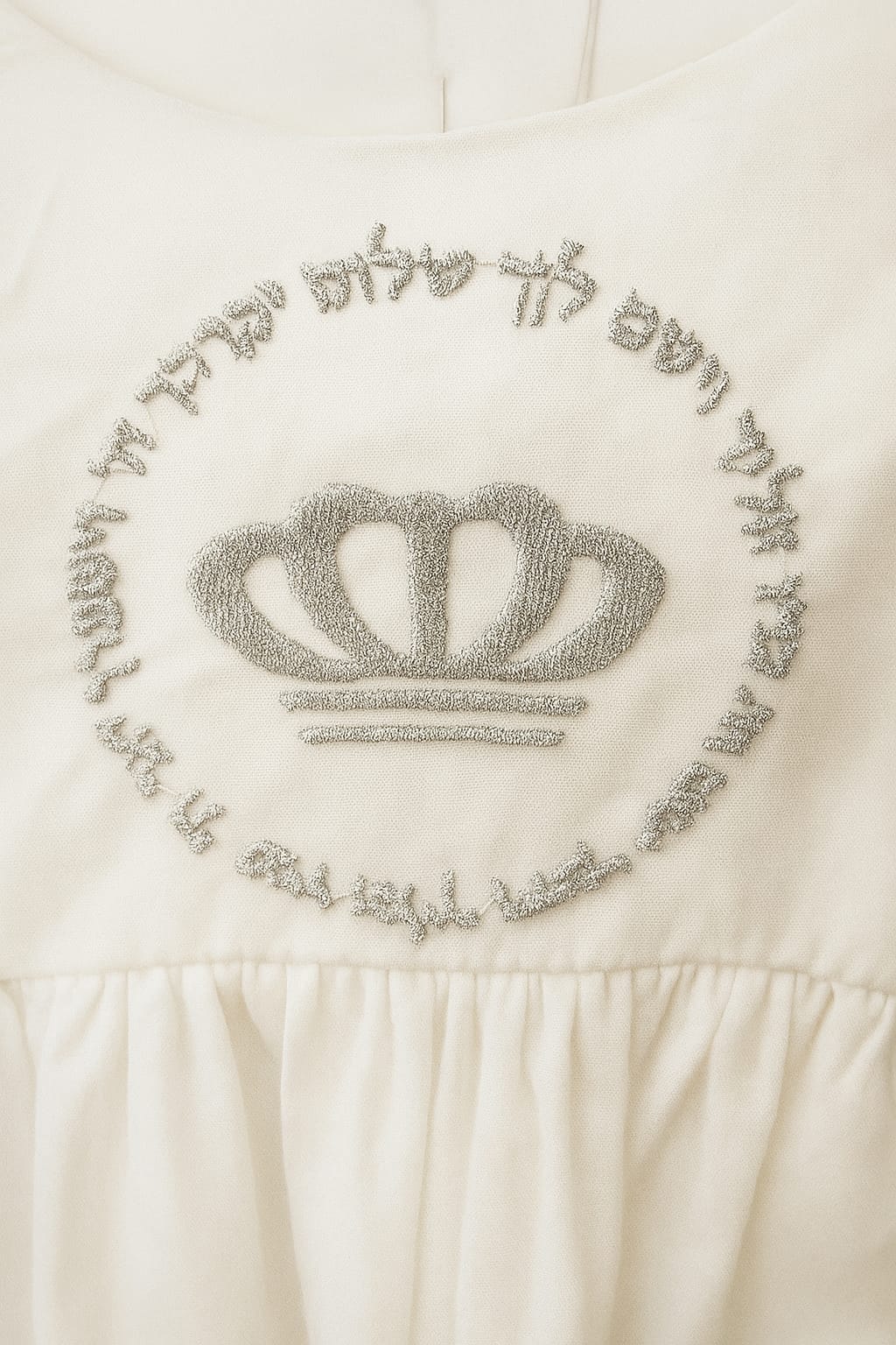 Son design sobre et raffiné est sublimé par une broderie artisanale — flamme ou couronne avec la Braha des Cohanim — symbole de lumière et de bénédiction, disponible en fil doré ou argenté.